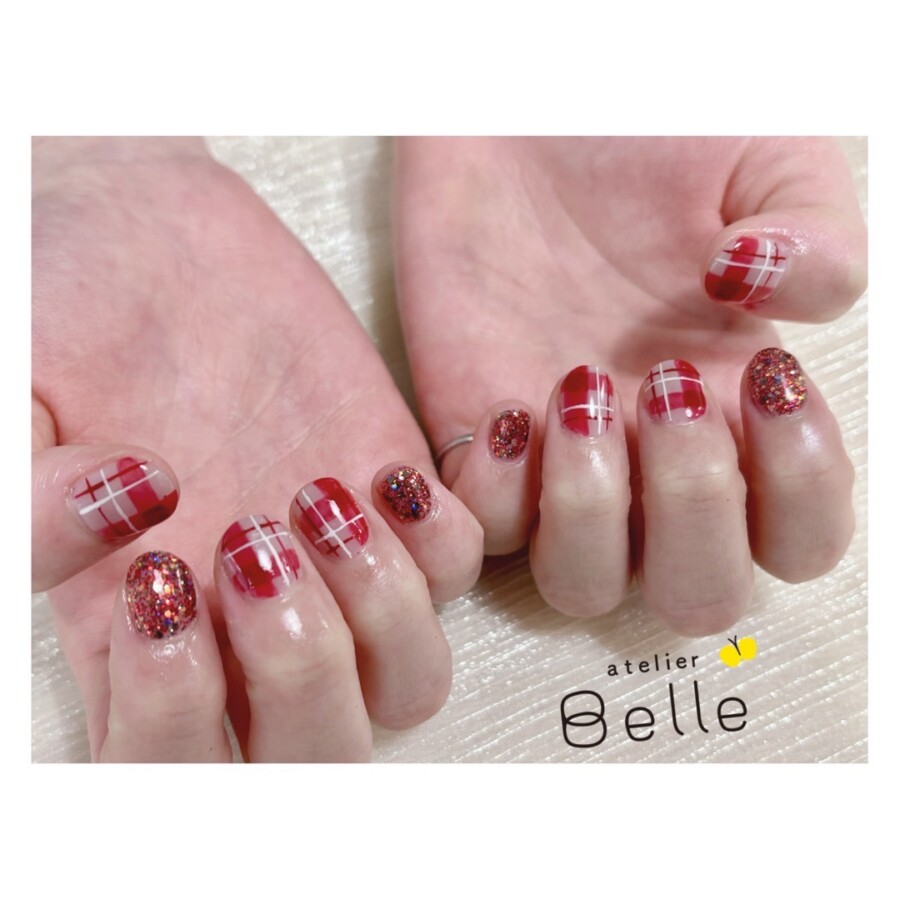 【あったかカジュアルネイル】赤みブラウンチェック×ラメアートで華やかに