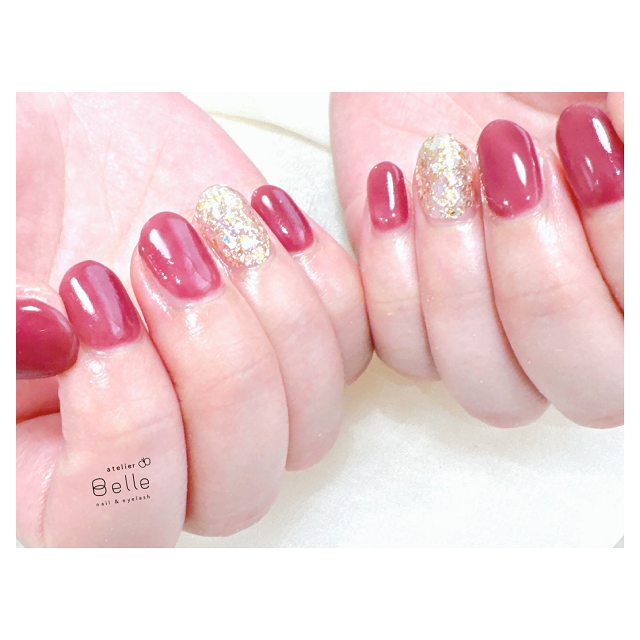 ボルドーカラーの隣に添えられたゴールドは大粒のラメが存在感たっぷり!
