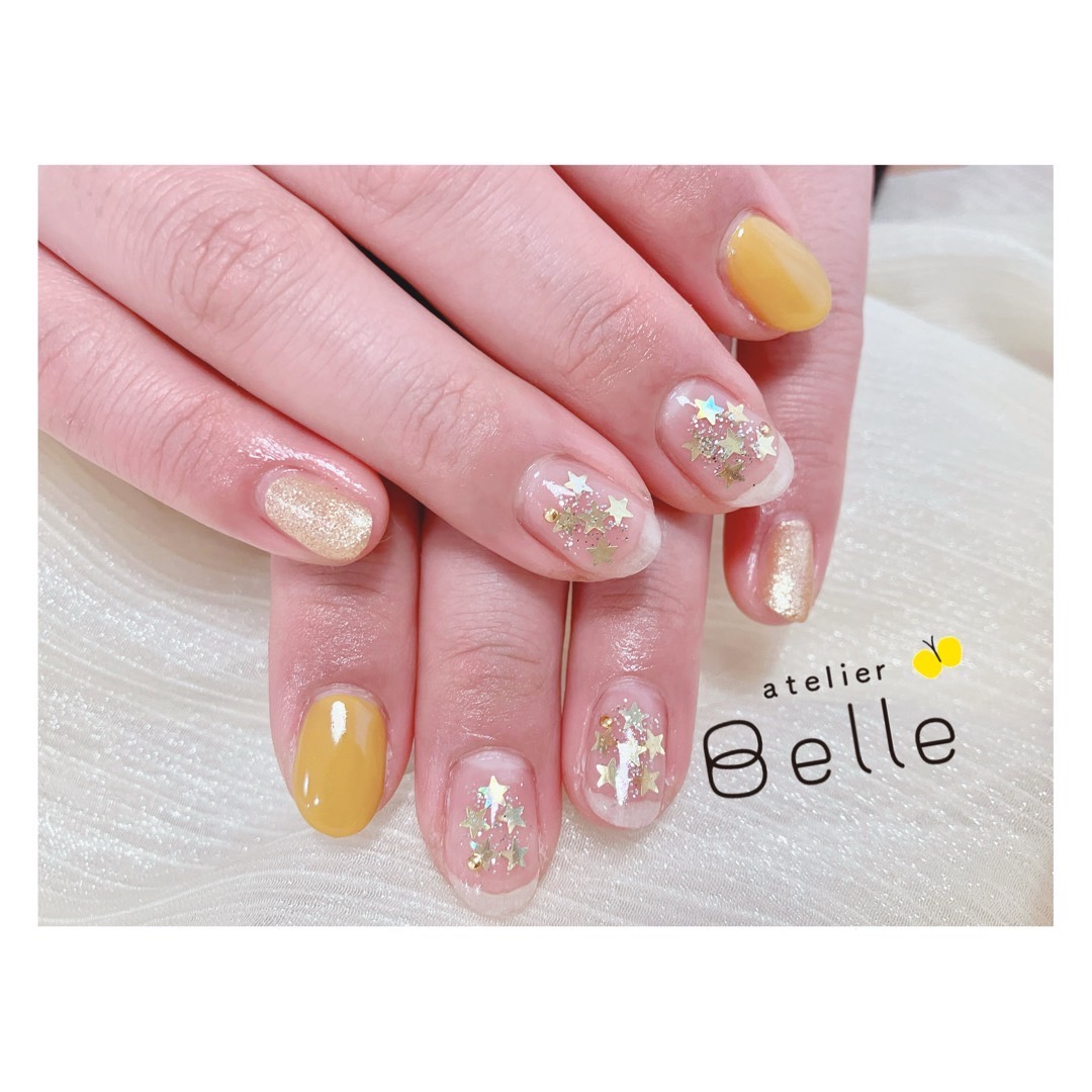 【キュートネイル】マスタードカラーに映えるキラキラ星アートがおすすめ