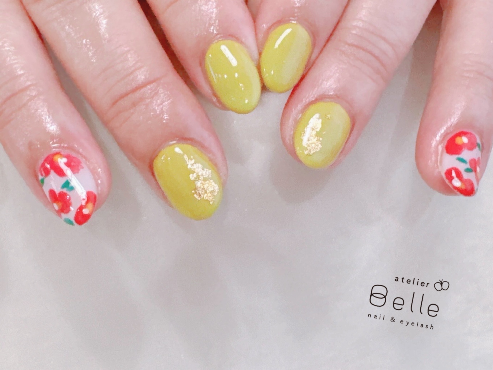 今回は、明るいイエローのネイルカラーをベースに、赤い椿のお花アートを乗せた華やかなネイルデザインをご紹介いたします。