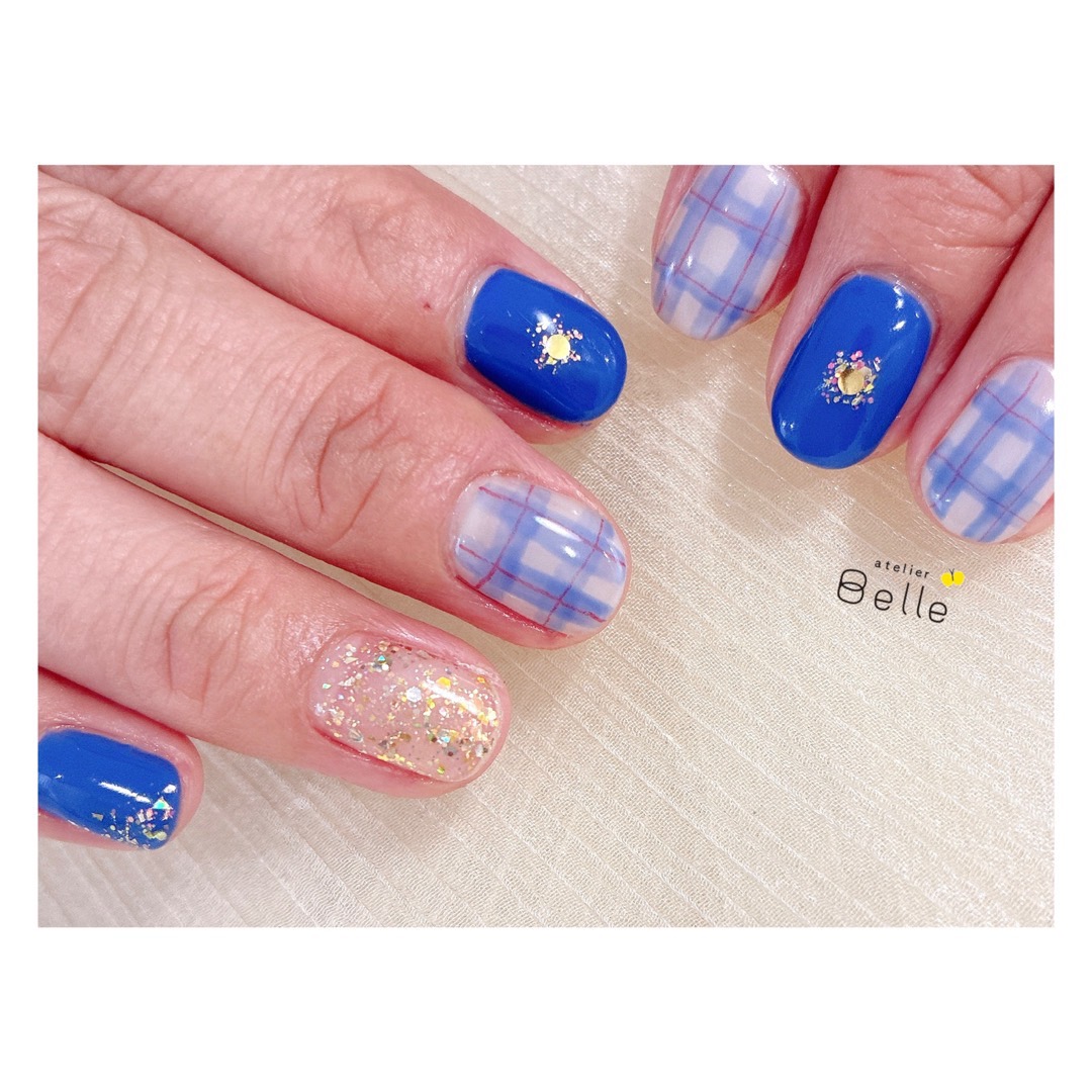 ブルー×淡いブルーのチェック柄が新鮮!ゴールドのラメがアクセント
