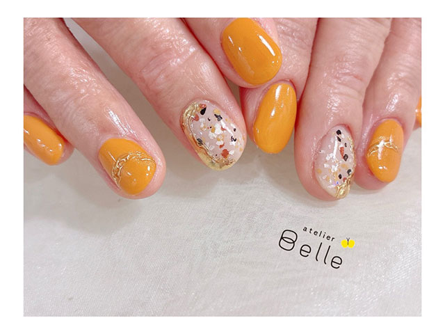 【大人ニュアンスネイル】ラメアートとの相性抜群!マスタードカラーで魅せる指先