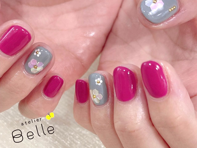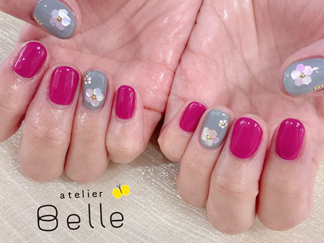 【上品ネイル】ビビッドピンクとグレーにフラワーアートで大人っぽく