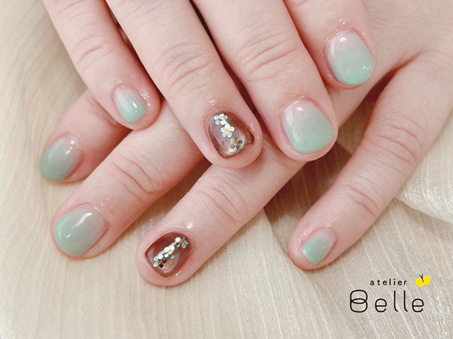 今回は、ふんわり柔らかいイメージのミントグリーンのネイルカラーをベースに、