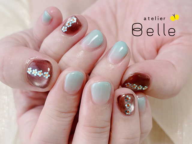 【フラワーネイル】おすすめ!ミントグリーンとブラウンがシックでキュート