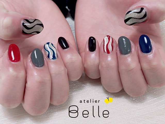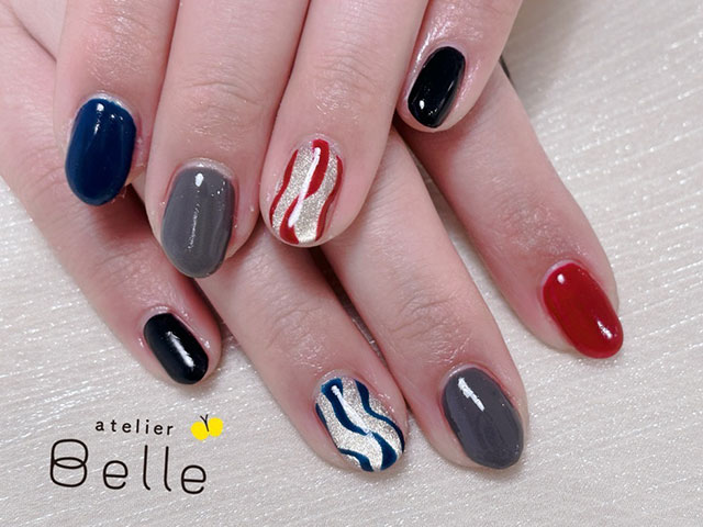 今回は、ネイビーやグレー、ブラックのネイルカラーにレッドカラーをアクセントにした、落ち着きのあるモードなネイルデザインをご紹介いたします。