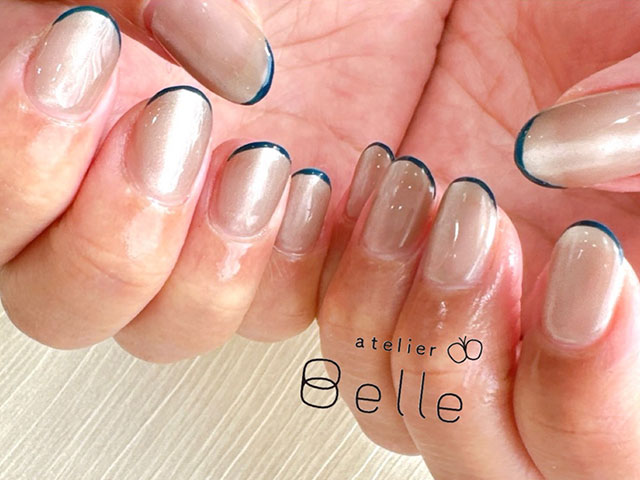 今回は、上品な輝きが魅力のゴールドベージュのマグネットカラーに、深みのあるブルーカラーで細フレンチに仕上げた大人っぽいネイルデザインをご紹介いたします。