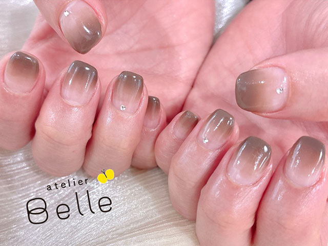 根元はクリアカラーにして抜け感を残し、先端に向かって自然に色づくことで、指先がすっきりときれいに見えるデザインです。