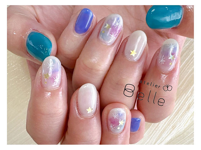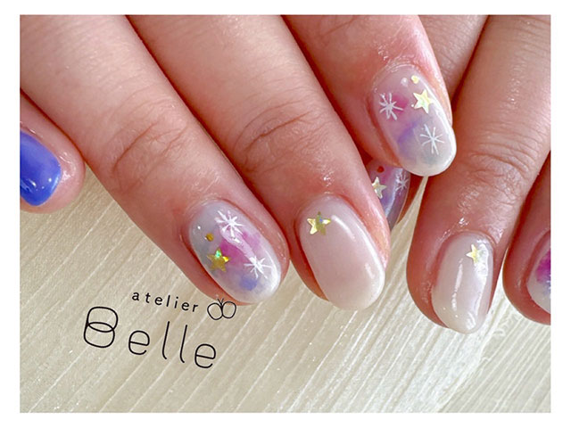ふんわりと混ざり合うニュアンスカラーに、星のパーツや繊細なきらめきアートをプラスして星空のような雰囲気に仕上げました。