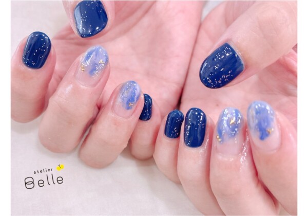 【ブルーネイル】トーンの異なる2色に散りばめられたゴールドがアクセント